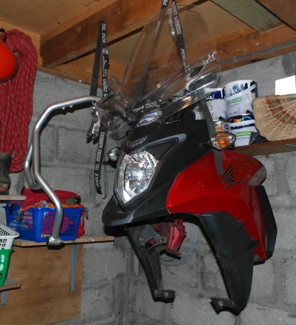 Took the shortcut someone on the CB500X forum suggested for removing the fairings by simply undoing 8 screws & 2 bolts, disconnecting a couple of plugs and easing the whole thing (incl. headlamp & instrument panel) away forwards. Image of the whole fairing hanging up next to the crash bars, from where it surveyed me as I nervously followed Ren's instructions for the rest of the process. Ren's advice re removing the top coolant pipe was good - esp as I was replacing the coolant - and I left the pair valve attached to the tray rather than detaching it.